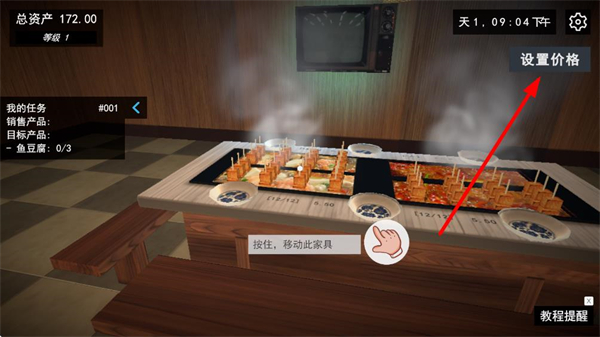 5、食材放置完成后,点击设置价格按钮,可根据成本与市场需求调整鱼豆腐等食材的售卖价格,价格设置需平衡利润与顾客吸引力。
