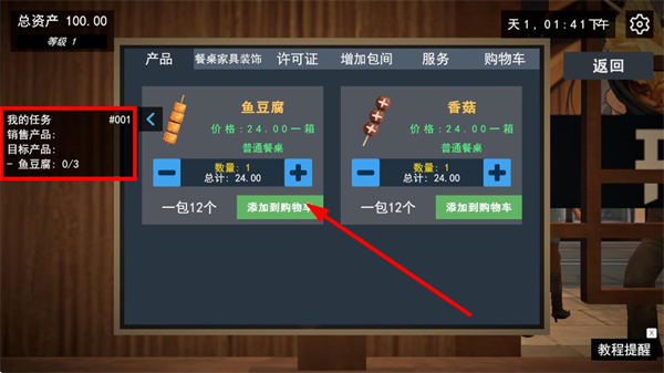 2、按照任务需求,点击产品添加到购物车结算完成采购,采购是经营基础,需确保食材充足。