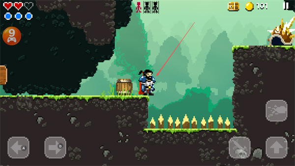 1、操控勇士在像素场景中,注意躲避火焰陷阱,瞄准高处敌人,准备发起攻击。