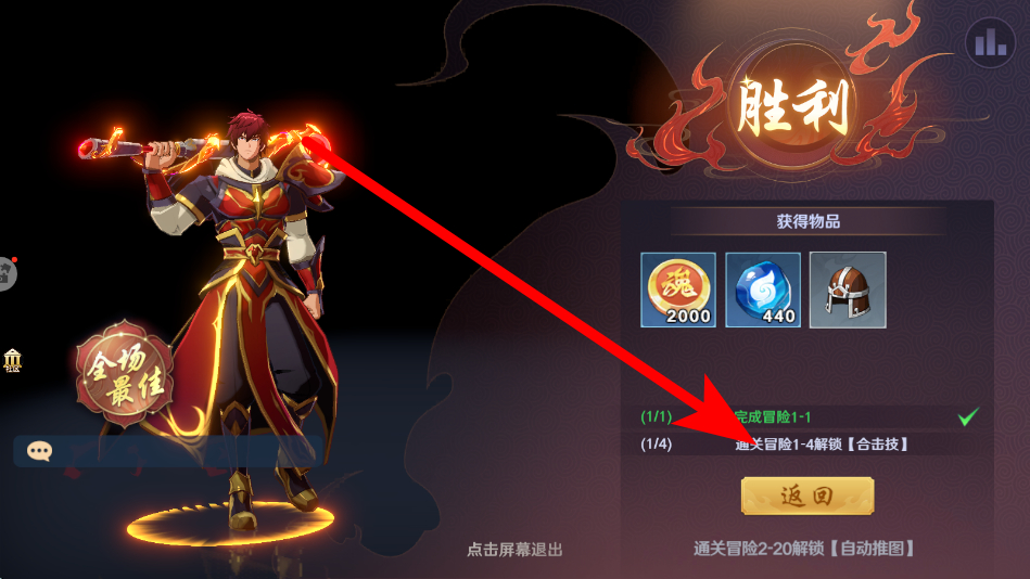 4、最后获取胜利,战斗中击败敌人,就能获得胜利,同时还能解锁新的技能,如通关特定冒险可解锁合击技等,收获游戏成果与乐趣。