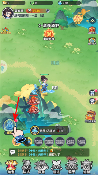 2、按照箭头指引点击游历按钮,可触发自动战斗推进关卡,这是快速通关、积累经验的核心方式。