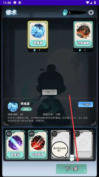 2、购买完之后,进入修术界面,学习购买技能,点击下一层。