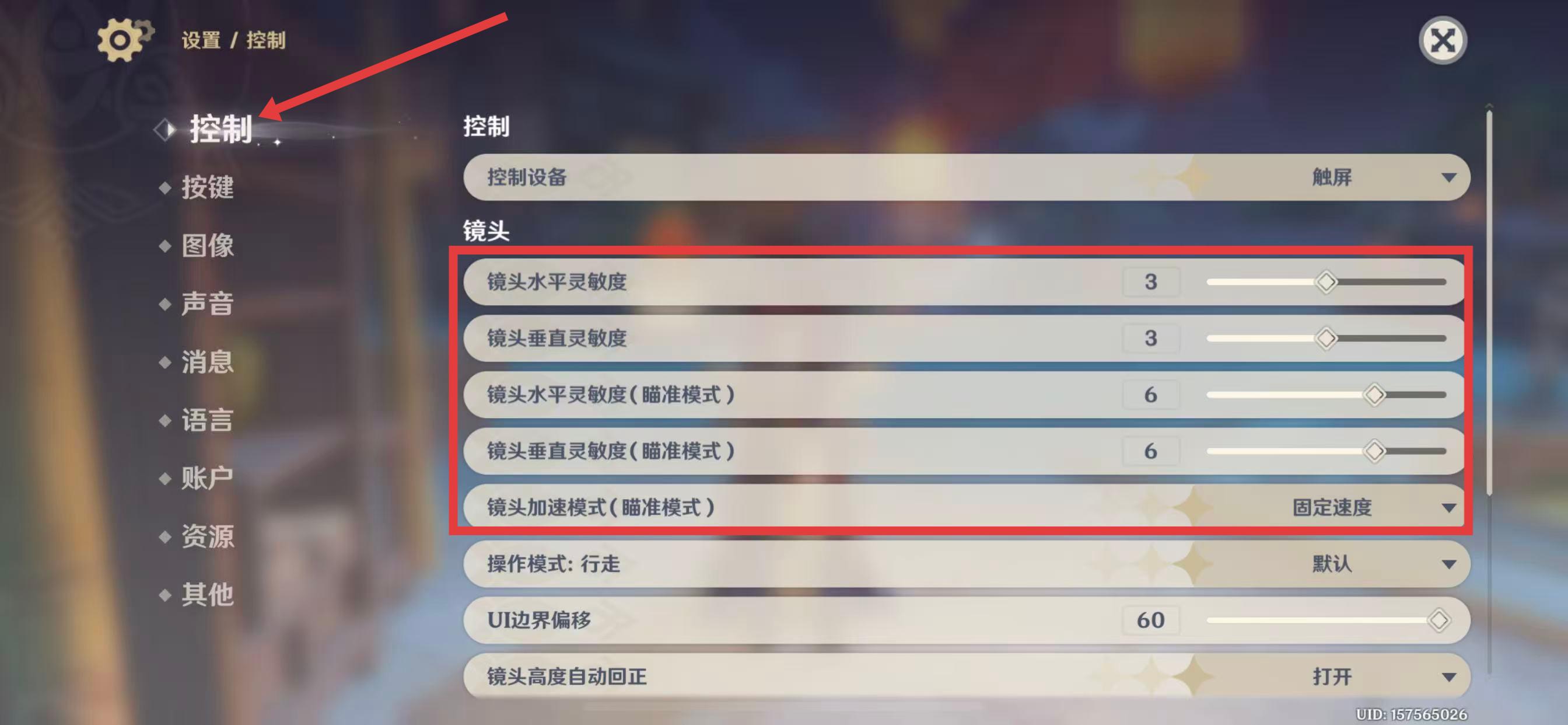 3、通过拖动对应选项的滑块,就能调整镜头在不同状态下的灵敏度,还能设“镜头加速模式(瞄准模式),选择固定速度或其他模式来满足操作习惯。