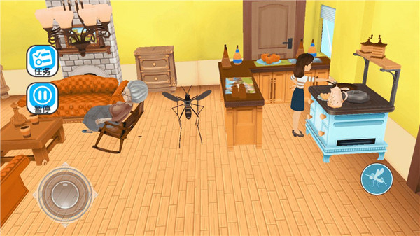 通过虚拟摇杆控制蚊子移动,点击按钮完成吸血动作,操作逻辑简单,新手几分钟内即可掌握飞行与躲避技巧。