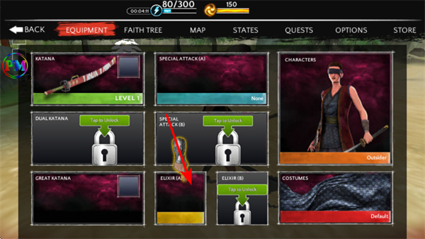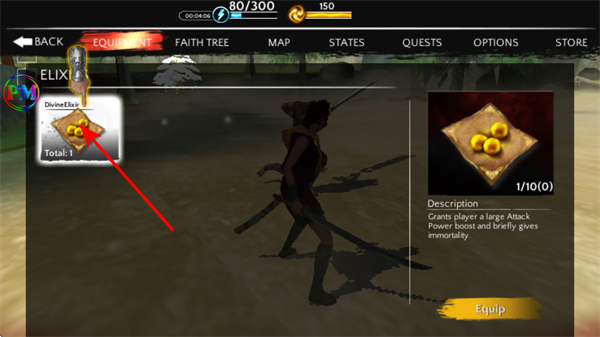 2、战斗前或血线危急时,点击DivineElixir药剂图标,这是使用增益道具的核心步骤,可提升攻击力并获得短暂无敌,敌人前及时使用以强化战力。