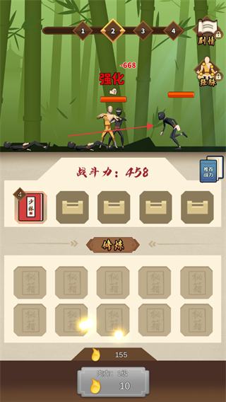 4、持续合成高等级武学、消耗资源强化,逐步提升战斗力推进关卡。