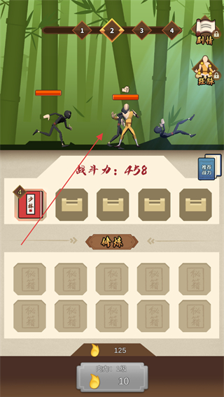 1、将低等级武学卡片如2级拖动到修炼栏,消耗资源强化提升战斗力。