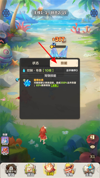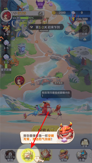 4、完成主线关卡后,点击挑战按钮进入挑战玩法,这是获取养成资源的核心步骤,参与挑战可积累资源用于宠物培养,助力后续关卡推进。