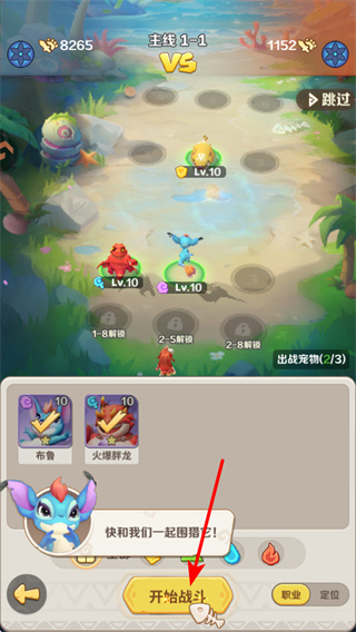2、在战斗开启界面,点击开始战斗按钮,这是触发主线1-1战斗的核心步骤,点击前需确认出战宠物配置,确保以合适阵容开启战斗。