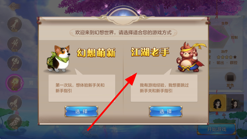 2、进入游戏后,可选择适合自己的游戏方式,若是第一次玩,可选择幻想萌新,体验新手关和新手指引,若有经验,可选择江湖老手,跳过新手关和指引。
