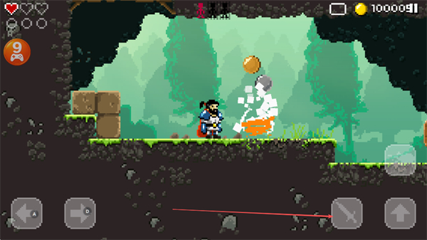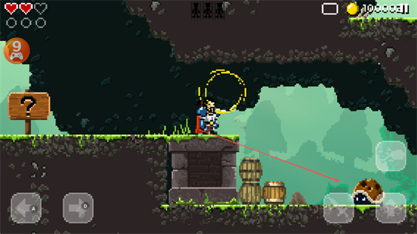 1、操控勇士在像素场景中,利用武器攻击蜗牛等敌人,探索带问号木牌区域,收集金币。