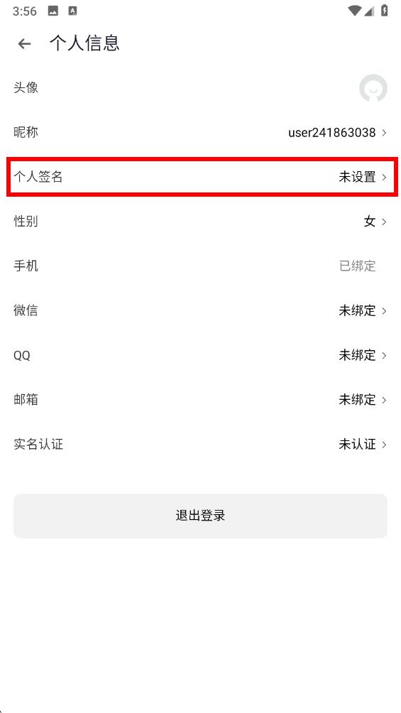 3、进入个人信息界面后找到个人签名选项,点击该选项就会进入个性签名编辑页面。
