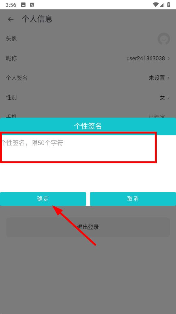 4、在个性签名编辑页面的输入框内,输入你想要设置的个性签名,输入完成后点击确定按钮即可成功修改个性签名。