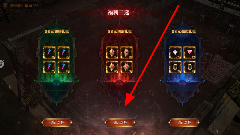 2、福利三选一中,根据需求选择翅膀礼包、词条礼包或强化礼包,点击对应确认选择按钮,获取礼包道具,助力角色成长。