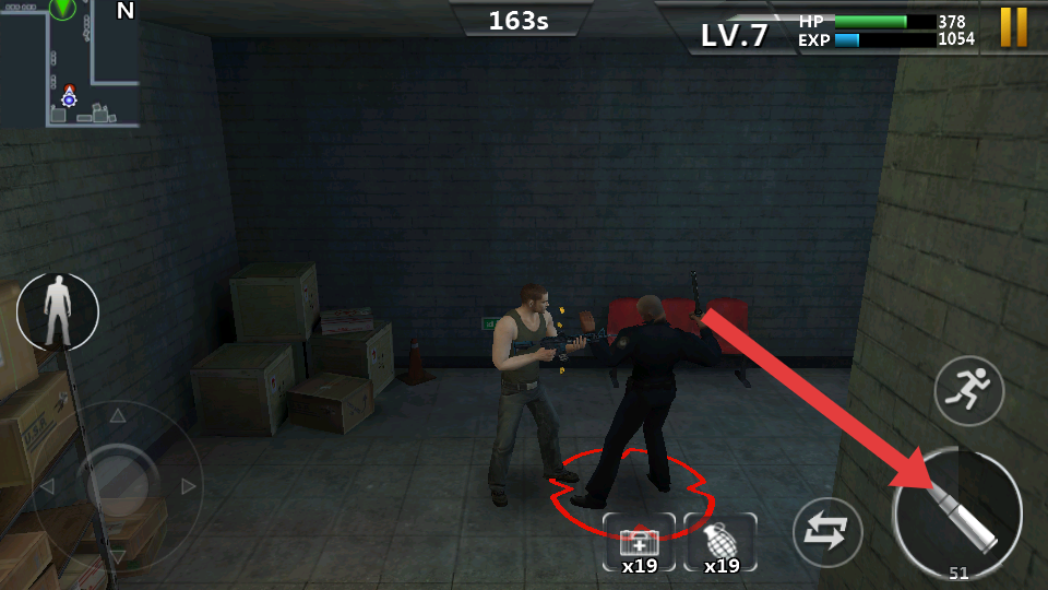 1、进入室内战斗场景后,先关注屏幕上方的生命值与经验值面板,优先熟悉基础操作,点击射击按钮使用枪械攻击敌人。