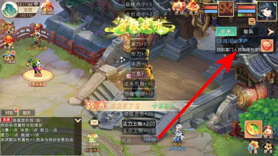 3、接着跟随主线,找到主线任务提示,像[主线]初出茅庐等,按照指引找到掌门人领取任务,推进冒险进程,体验奇幻故事。