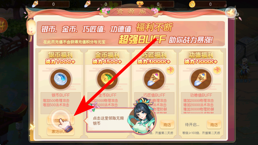 2、然后领取福利,进入资源阁,能看到银币、金币等福利,获取相应福利,这些福利可助力角色在奇幻世界中更好地发展。