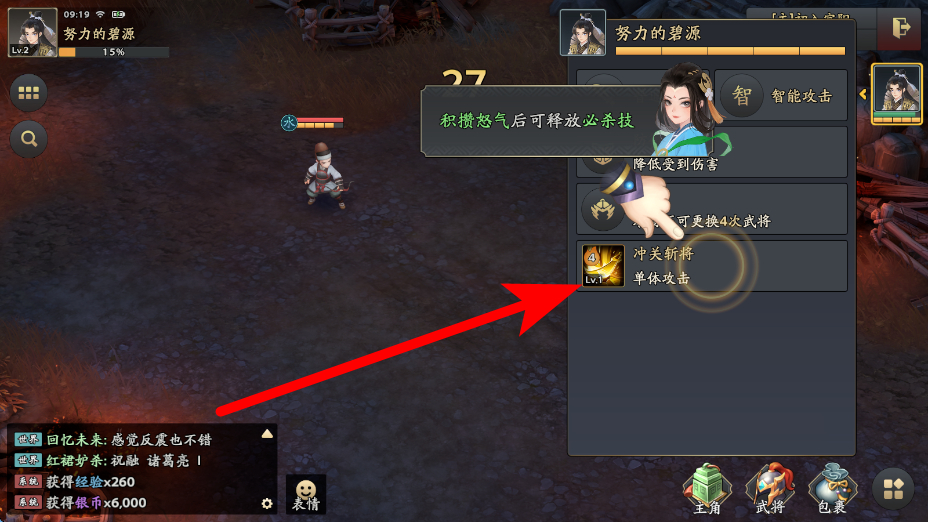 4、怒气积攒足够后,释放必杀技,像冲关斩将这类单体攻击必杀技,能对敌人造成强力伤害,要留意怒气积攒情况,适时释放提升战斗效率。