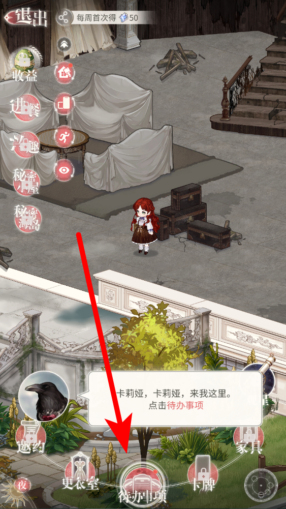 1、待办事项方面,界面会提示前往待办事项,点击相应按钮,可查看并处理待办内容,推进剧情与养成进程,让角色按流程开展活动。