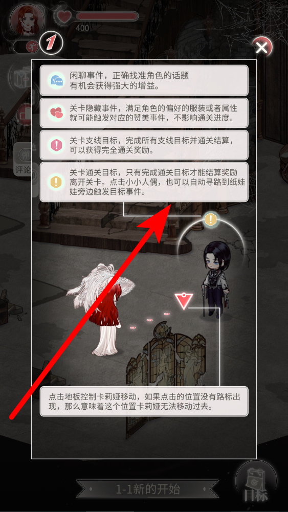 4、关卡开启后,会有闲聊事件、隐藏事件、支线目标、通关目标等说明,了解这些规则后,操控角色在关卡内移动,完成各类目标获取奖励。