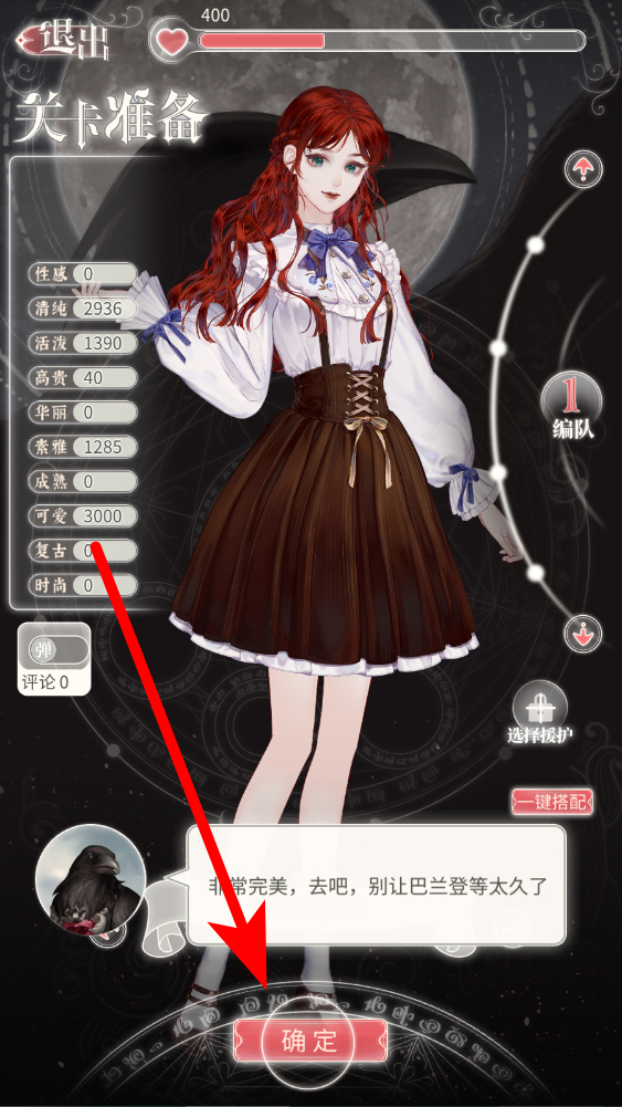3、准备打扮环节,可查看角色的各项属性,还能进行服装搭配等操作,打造符合关卡需求的角色形象,点击确定,即可完成关卡准备。