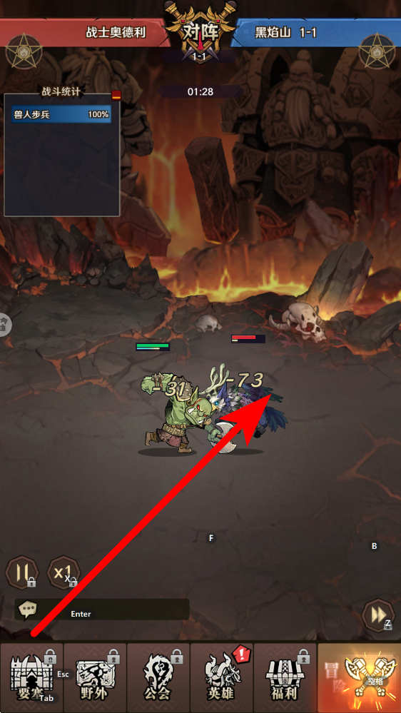 2、对战操作战斗中操控英雄战士奥德利与兽人步兵等敌人交锋,观察伤害数值,把握技能释放节奏,通过普攻与技能配合击溃敌人,推进战斗进程。