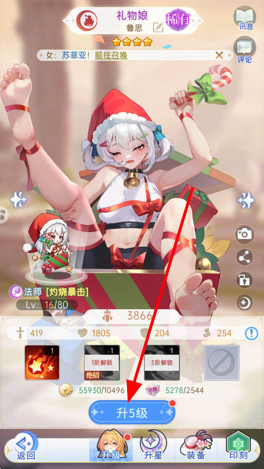 4、角色界面,若有足够的资源,点击升5级等升级按钮,提升角色等级,增强角色的各项能力,更好的冒险与战斗。