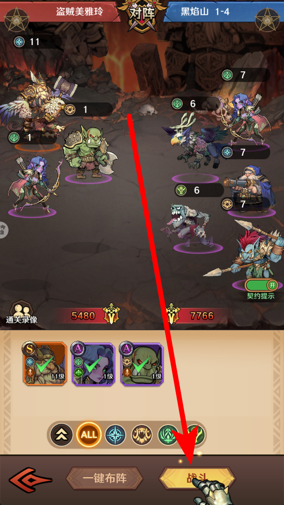 1、战前布阵进入黑焰山对阵界面,查看敌我双方阵容,点击一键布阵或手动调整己方英雄站位,依据英雄特性与敌方弱点优化阵容,提升战斗胜率。