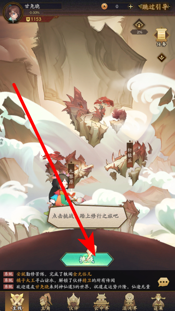 2、新手开始游戏主线挑战创建角色后,在主界面依据指引点击挑战,进入修行场景,开启主线关卡,跟随提示推进,完成初期任务获取资源。