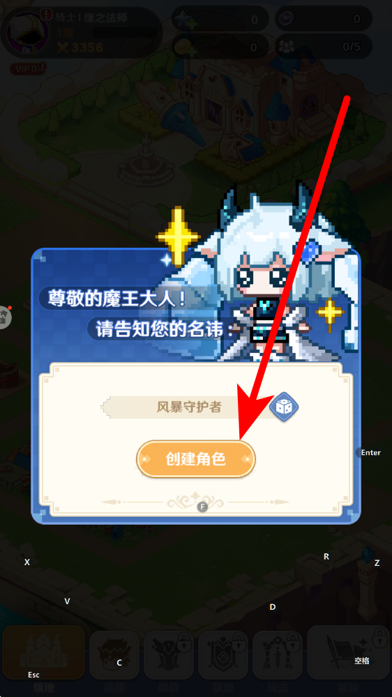 1、角色创建游戏开局弹出命名弹窗,可选用系统推荐名或自定义,点击创建角色按钮,确定魔王身份,此为浮空岛冒险的起始步骤,奠定后续发展基础。