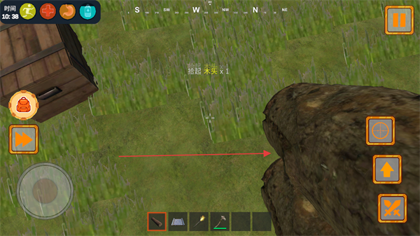 3、持续探索场景,拾取更多资源如木头、类木,积累生存材料。
