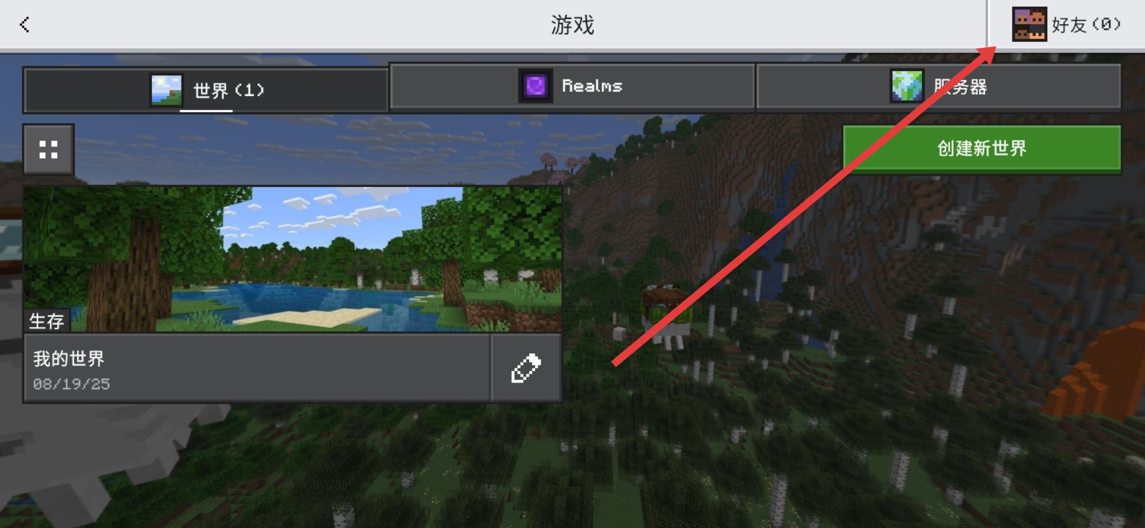 1、进入我的世界创建游戏主界面,点击右上角好友0图标,进入好友管理界面,开启添加好友流程。