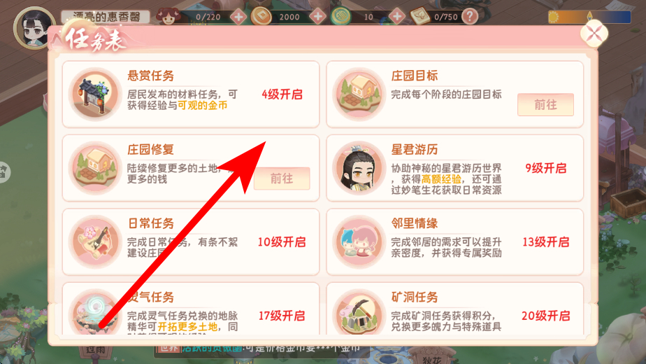 3、庄园事务包含悬赏任务、庄园修复等多种类型,不同任务开启等级不同,像悬赏任务4级开启,完成这些任务可获得经验、金币等奖励,助力庄园升级与发展。