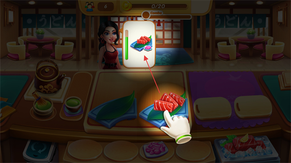 3、同时处理多位顾客的不同订单如寿司、抹茶,高效制作料理。