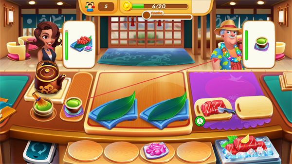 4、及时完成顾客订单,获取金币奖励,积累分数推进烹饪之旅进程。