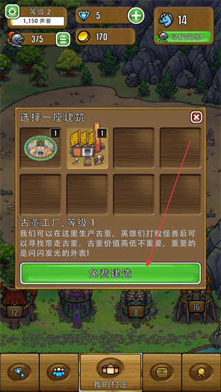 4、选择古董工厂建筑,点击免费建造,解锁该建筑生产古董的功能。