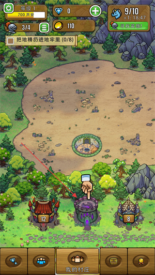 1、跟随指引点击建筑,推进把地精扔进地牢里任务,当前等级1,金币110。