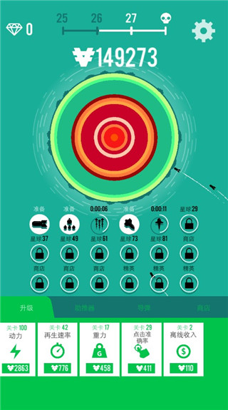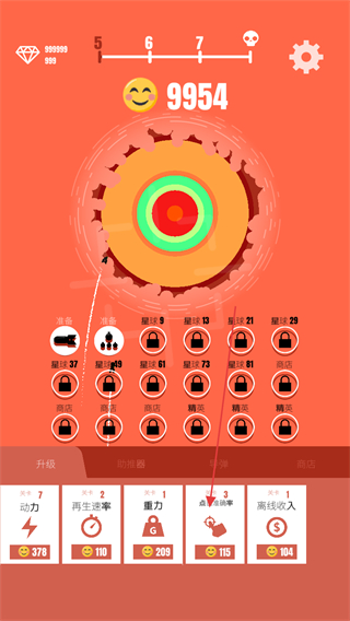 2、可升级下方的属性如动力、再生速率、重力、暴击率、离线收入,提升炸弹的威力、发射频率等,助力得分。