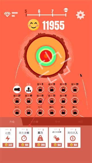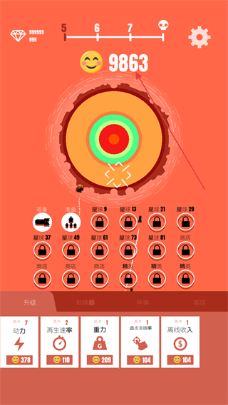 4、持续发射炸弹命中靶心,积累分数,推动上方进度条发展,不断挑战更高分数,解锁更多关卡和内容。