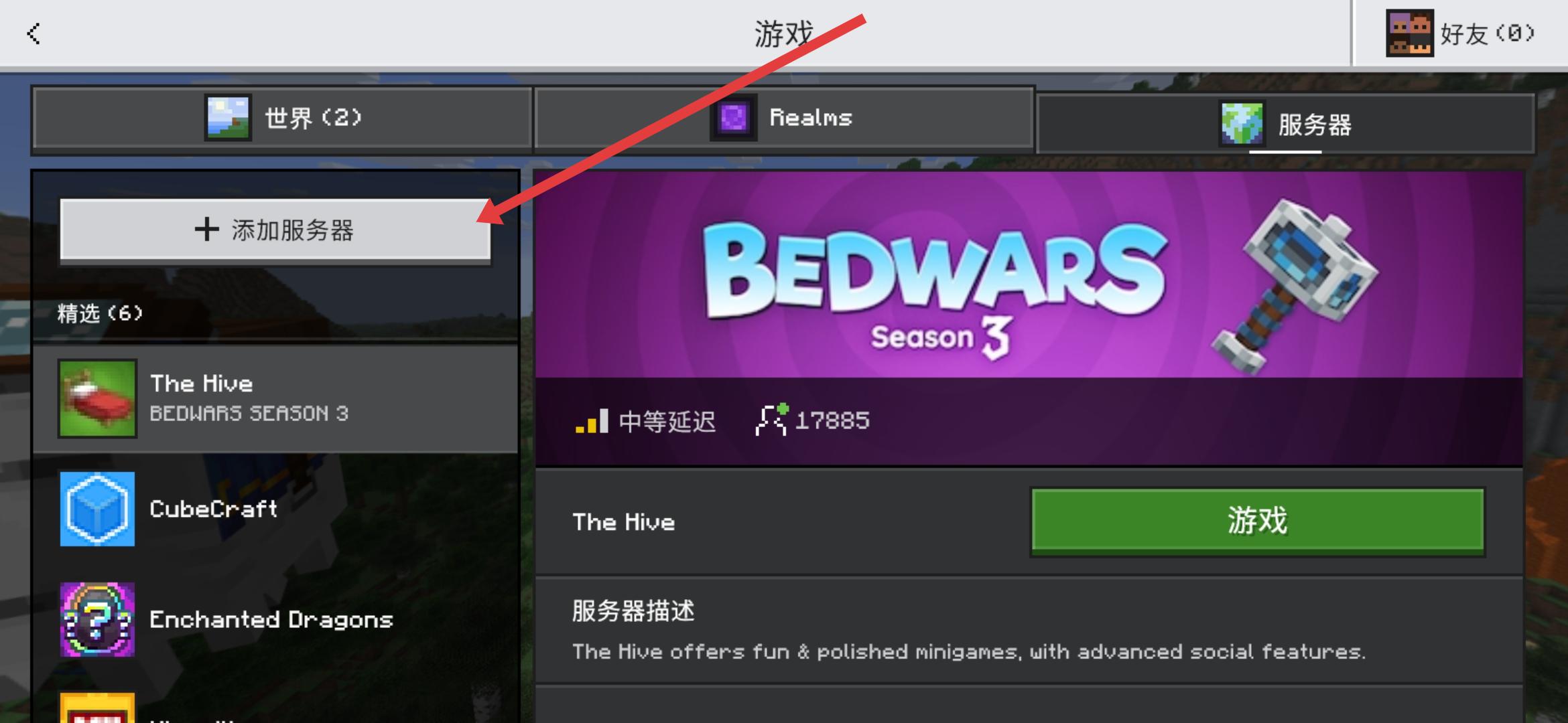 3、回到服务器的列表,可以看到已添加的服务器会展示在界面中,可以选择该服务器进行联机游玩。