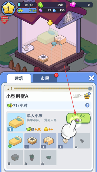 4、在别墅界面选择单人小床,消耗1.6k金币升级,提升建筑收益。