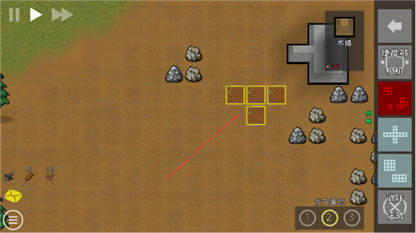 3、选择建筑区域黄色格子,使用资源建造建筑如木墙,拓展殖民地。