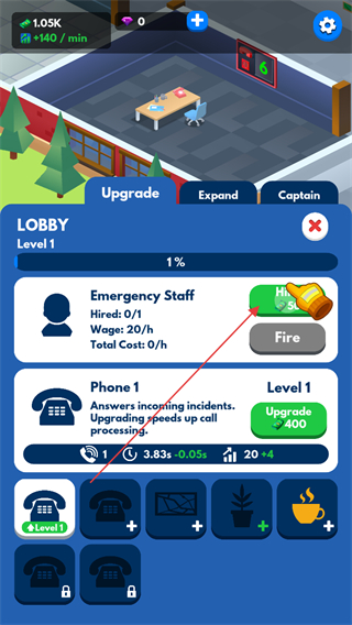 2、在LOBBY界面,用道具雇佣EmergencyStaff,升级Phone1提升事务处理效率。