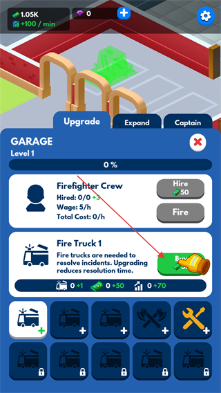 3、切换到GARAGE界面,用道具解锁FireTruck1,可雇佣消防员crew增强救援能力。