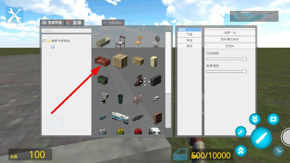 3、选择箭头指向的沙发道具,可在场景中生成沙发,用于建造或装饰,丰富游戏内的场景布置。