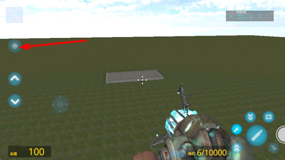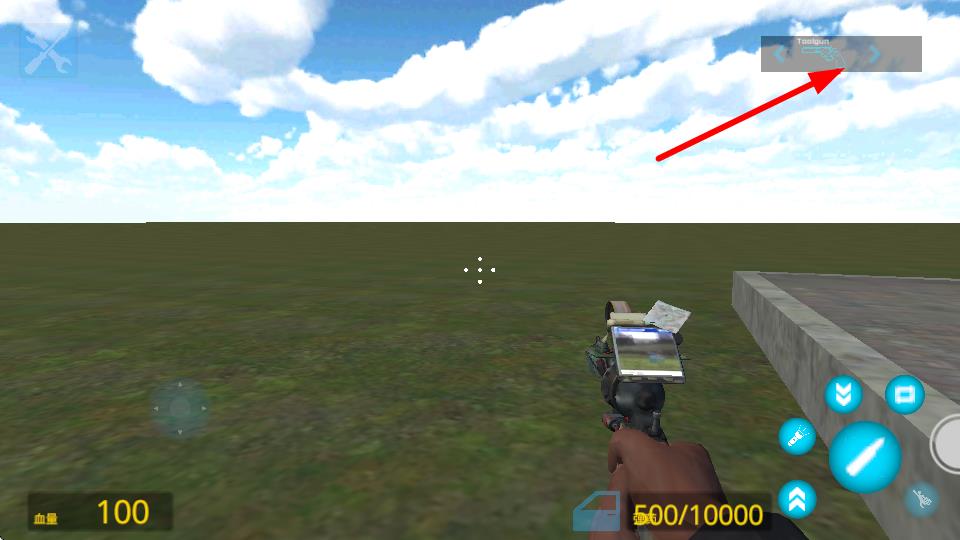 1、点击右侧箭头指向的按键,可切换武器或工具,适应游戏场景和操作需求,攻击、建造等。