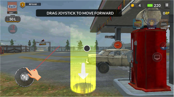 1、拖动摇杆向前移动,控制角色靠近加油站区域,准备进行加油操作。