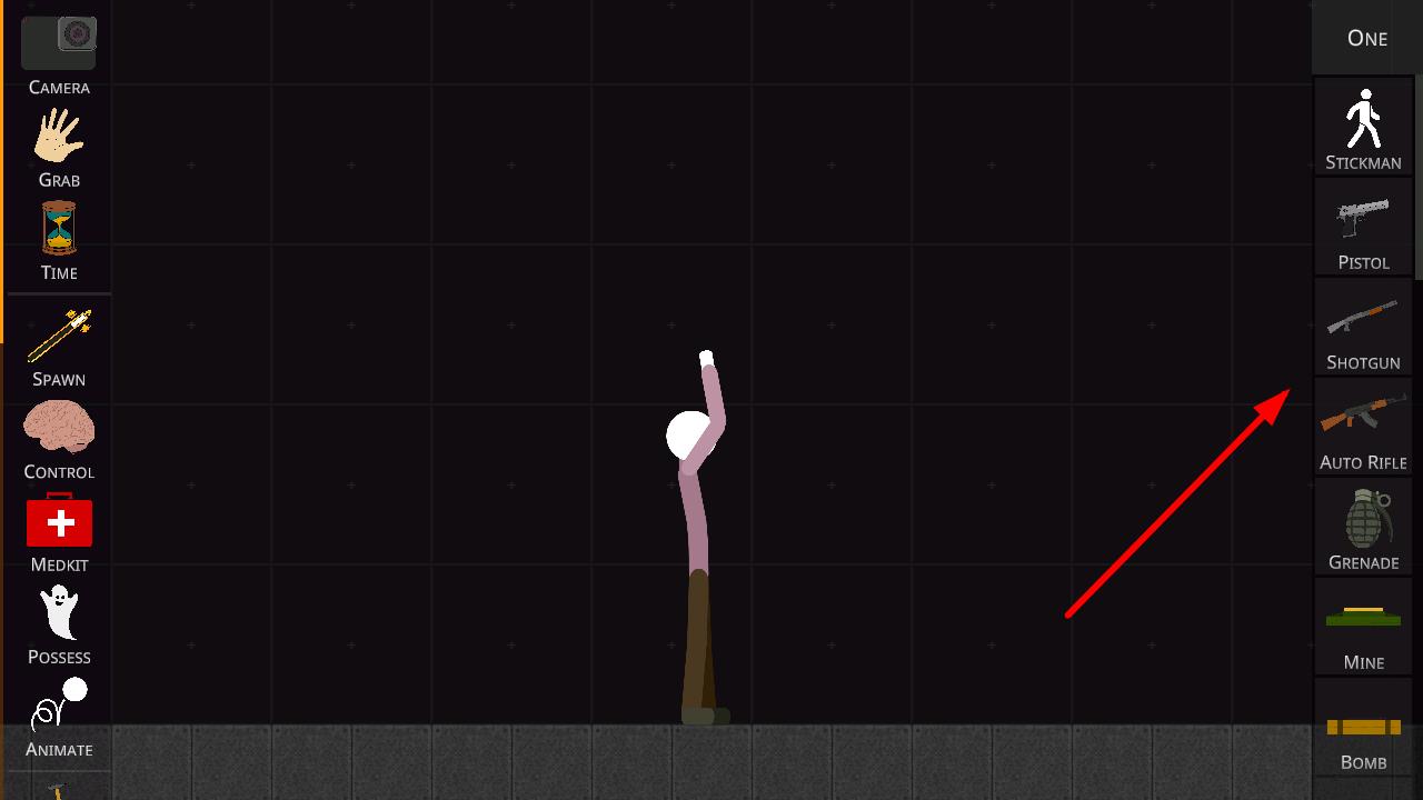 1、若想让火柴人持有武器,点击右侧武器列表,如SHOTGUN等。就能给火柴人配备相应的武器。