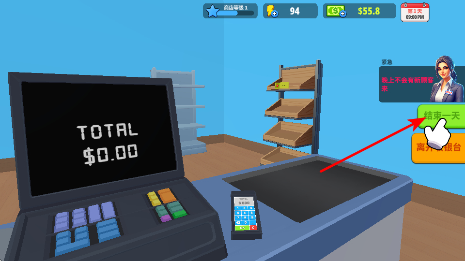 3、一天营业结束后,点击结束一天按钮,这是结算当日收益的关键步骤,点击后可进入次日运营升级阶段。