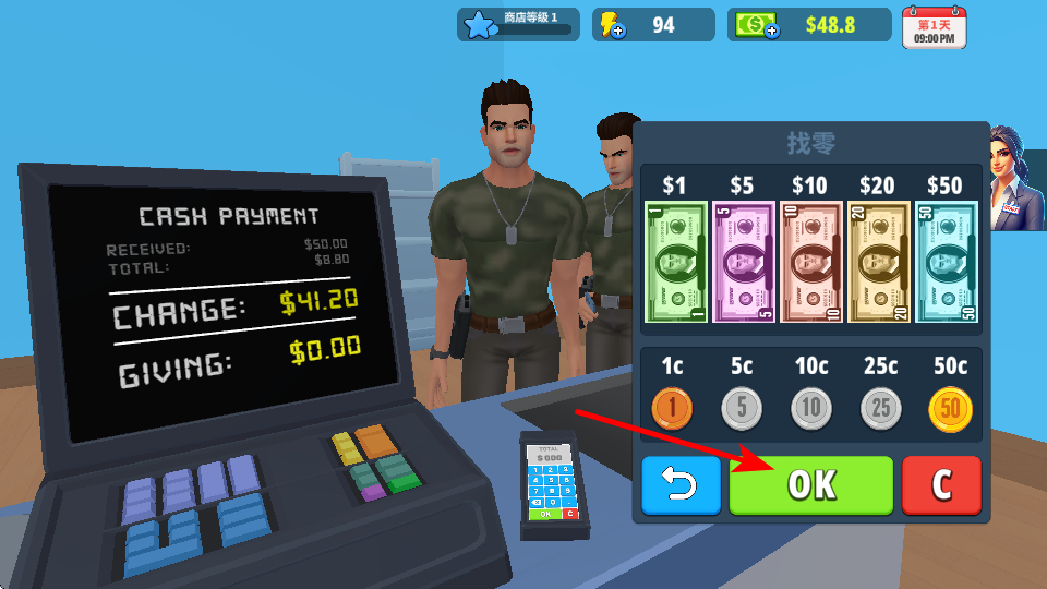 2、找零时,确认找零金额后点击OK按钮,这是完成找零流程的核心操作,点击后可结束该笔交易,提升满意。
